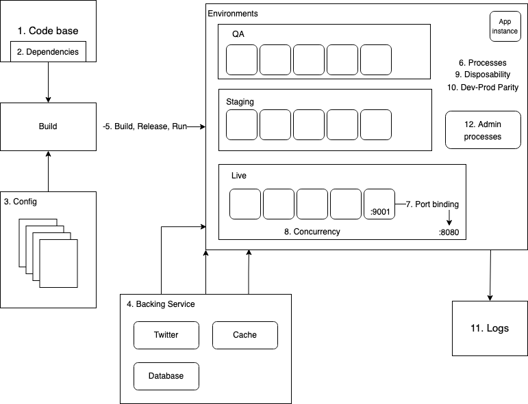 - Processes - This factor stated that we should execute the app as one or more stateless processes and store any data (if required longer than the current session duration) in a stateful backing service such as databases or cache services. Therefore, sharing data between different processes of the app violates this factor, instead, use shared cache session instead of in-memory storage to prevent loss of data. Like me, you may find this factor difficult to understand initially, but keep in mind that this factor is essential for factor 8 and factor 9, as well as scalability of the application.
